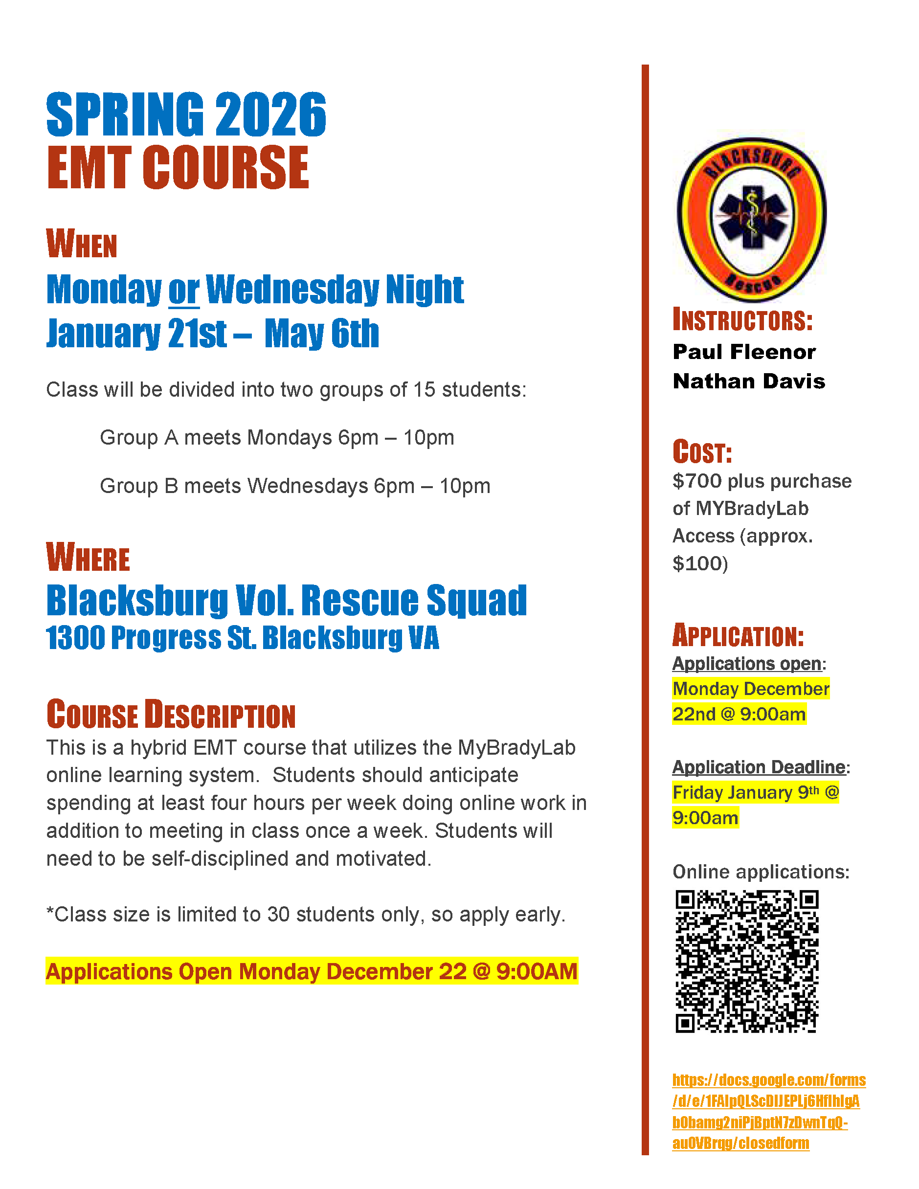 Applications Open: June 10 at 8:00 AM at www.blacksburgemtclass.com